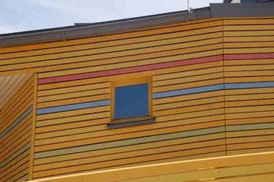 Die Holzlatten wurden unterschiedlich farbig lasiert. Insgesamt acht Farbtöne geben auf der Fassade den Ton an: Fünf verschiedene Gelbtöne lassen die Fassade lebendig wirken. Jeweils ein Rot-, Grün- und Blauton, die als Einzelstreifen eingesetzt wurden, verleihen der Farbkomposition einen eigenen Charakter.