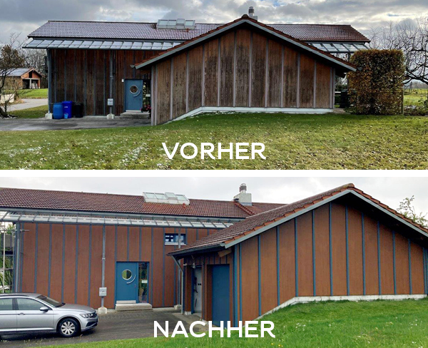 Nach 15 Jahren war die Holzfassade durch Sonne, Wind und Wetter abgewittert und musste saniert werden. Die neue Beschichtung sollte die Bauteile dauerhaft schützen, gleichzeitig ihre natürliche Schönheit wiederherstellen und eine matte Oberfläche erzeugen.